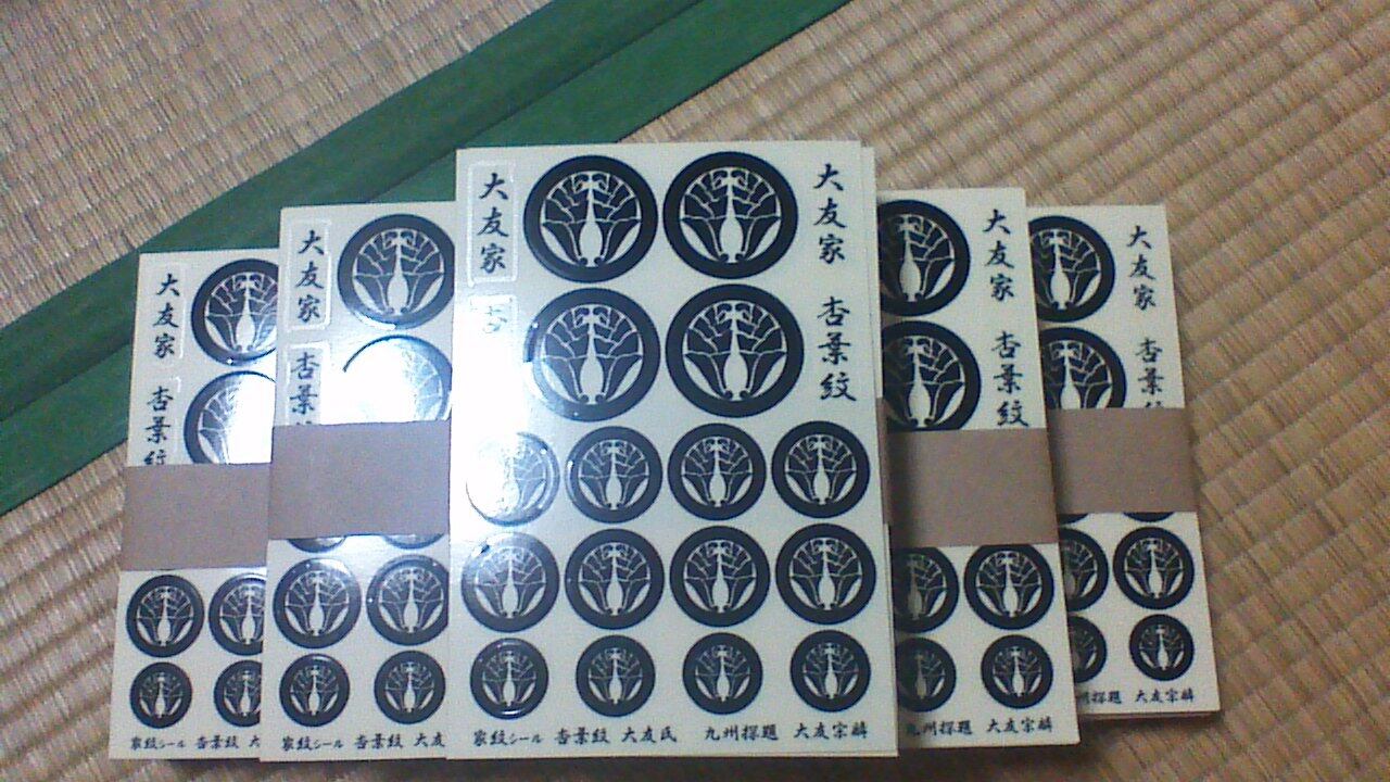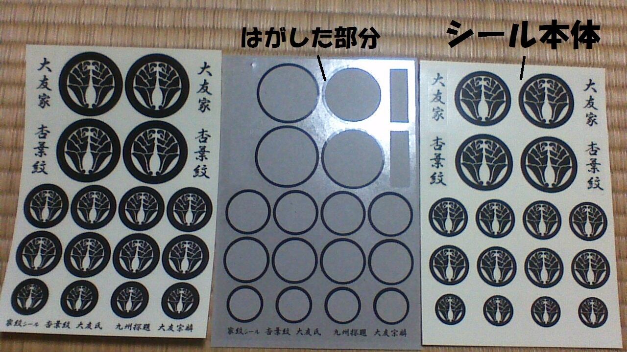 実際の大友家の杏葉は丸の囲みが無かったそうですがデザイン性とシール切り取りの目安として丸囲みの紋としました。